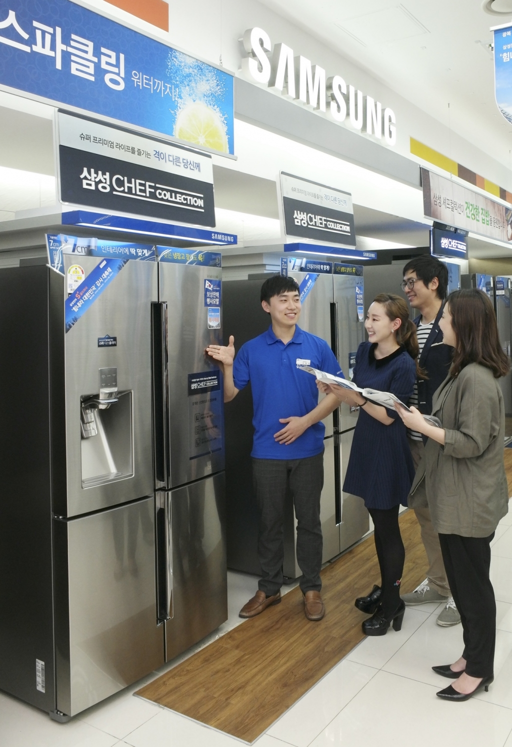 16일 염창동 삼성 디지털프라자 강서본점에 방문한 고객들이 미세정온기술로 식재료의 신선도를 유지시켜주는 삼성전자 슈퍼 프리미엄 냉장고 ‘셰프컬렉션’을 살펴보고 있다.