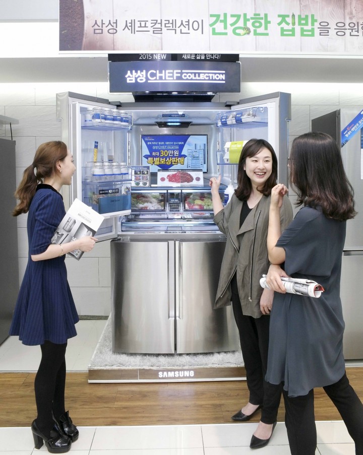 16일 염창동 삼성 디지털프라자 강서본점에 방문한 고객들이 미세정온기술로 식재료의 신선도를 유지시켜주는 삼성전자 슈퍼 프리미엄 냉장고 ‘셰프컬렉션’을 살펴보고 있다.