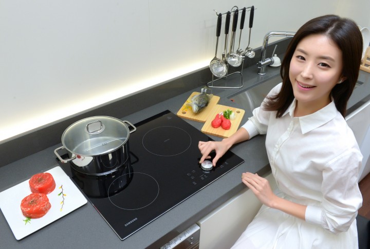삼성전자 모델이 17일 삼성전자 수원사업장 생활가전동 프리미엄하우스에서 인덕션 1구와 라디언트 2구의 화구를 하나의 제품에 적용해 화재나 화상의 위험을 줄이고, 유해가스 걱정 없이 건강하고 편리하게 요리 할 수 있는 삼성 '전기레인지 하이브리드'빌트인 타입을 소개하고 있다.