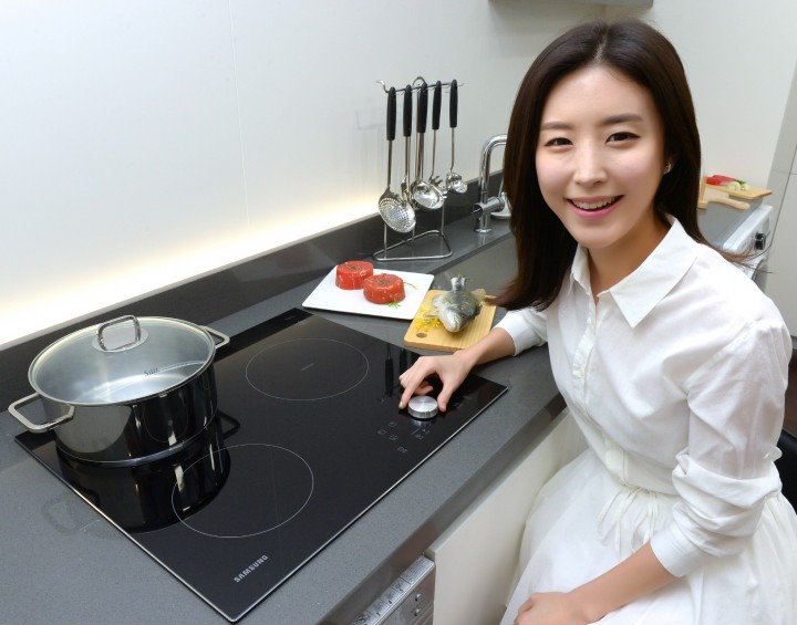 삼성전자 모델이 17일 삼성전자 수원사업장 생활가전동 프리미엄하우스에서 인덕션 1구와 라디언트 2구의 화구를 하나의 제품에 적용해 화재나 화상의 위험을 줄이고, 유해가스 걱정 없이 건강하고 편리하게 요리 할 수 있는 삼성 '전기레인지 하이브리드'빌트인 타입을 소개하고 있다.
