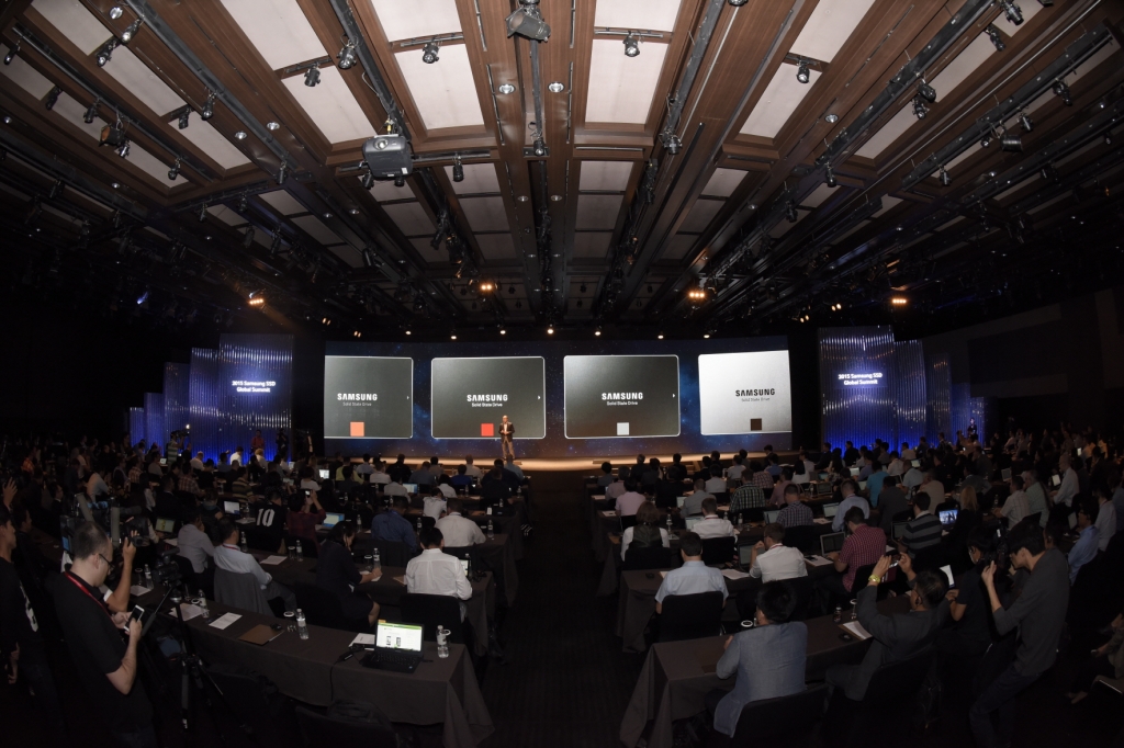 삼성전자가 22일 서울 호텔신라에서 열린 '2015 삼성 SSD 글로벌 서밋'에서 국내외 미디어와 파워 블로거 등 180여명이 참석한 가운데 'V낸드 SSD' 신제품을 공개했다. 삼성전자 메모리사업부 브랜드마케팅팀장 김언수 전무가 환영사를 하고 있다.