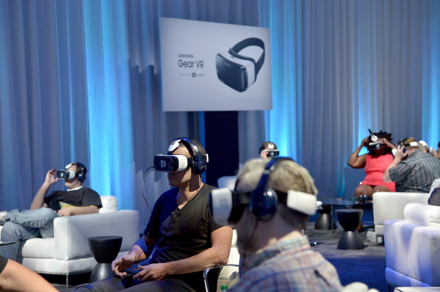 24일(현지시간) 미국 로스앤젤레스에서 열린 '오큘러스 커넥트2' 행사에서 참가자들이 '삼성 기어 VR' 신제품을 체험하는 모습