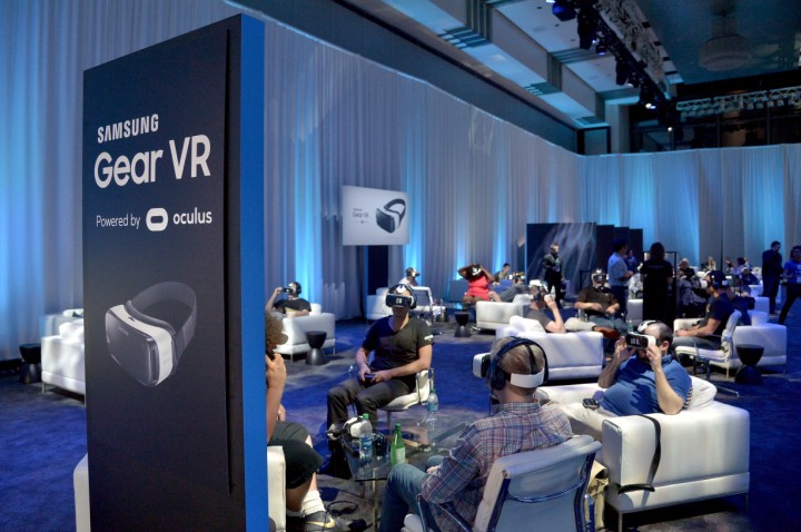 24일(현지시간) 미국 로스앤젤레스에서 열린 '오큘러스 커넥트2' 행사에서 참가자들이 '삼성 기어 VR' 신제품을 체험하는 모습