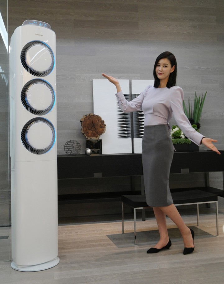 삼성전자 모델이 삼성전자 수원사업장 생활가전동 프리미엄하우스에서 뛰어난 냉방ㆍ청정ㆍ제습 성능에 난방 기능까지 갖춰 4계절 내내 쾌적한 실내 환경을 만들어 주는 삼성 스마트에어컨Q9000 냉난방 겸용 신모델을 소개하고 있다