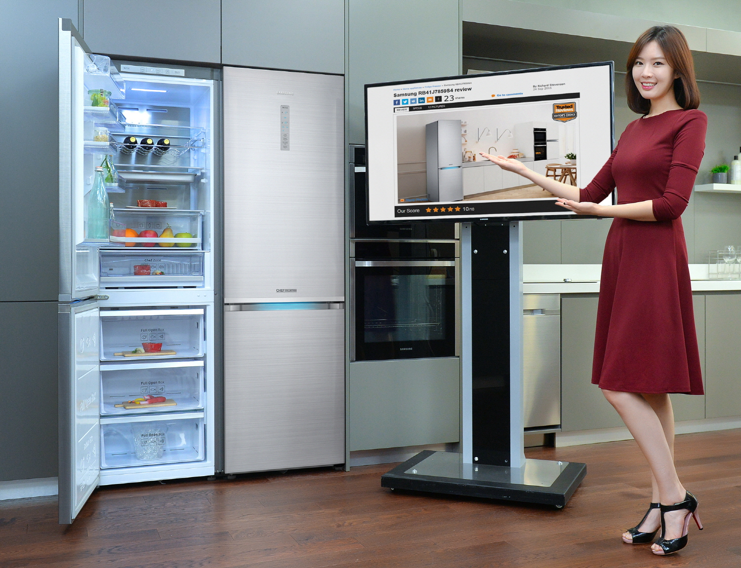 삼성전자 모델이 삼성전자 수원사업장 생활가전동 프리미엄 하우스에서 영국 최고 권위의 제품 평가 전문매체 ‘트러스티드 리뷰’ 평가에서 10점 만점을 획득하며 ‘에디터스 초이스’에 선정된 삼성 셰프컬렉션의 상냉장 하냉동 2도어 냉장고를 소개하고 있다. 트러스티드 리뷰가 상냉장 하냉동 2도어 냉장고 평가에서 10점 만점을 준 건 삼성 셰프컬렉션이 최초이며 “디자인과 기술에 대한 새로운 표준을 제시한 최고의 제품”이라고 극찬했다.