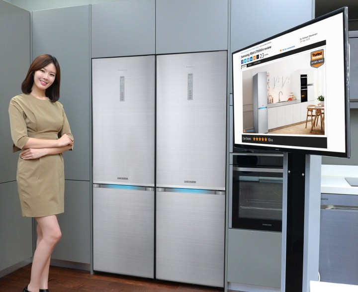 삼성전자 모델이 삼성전자 수원사업장 생활가전동 프리미엄 하우스에서 영국 최고 권위의 제품 평가 전문매체 ‘트러스티드 리뷰’ 평가에서 10점 만점을 획득하며 ‘에디터스 초이스’에 선정된 삼성 셰프컬렉션의 상냉장 하냉동 2도어 냉장고를 소개하고 있다. 트러스티드 리뷰가 상냉장 하냉동 2도어 냉장고 평가에서 10점 만점을 준 건 삼성 셰프컬렉션이 최초이며 “디자인과 기술에 대한 새로운 표준을 제시한 최고의 제품”이라고 극찬했다.