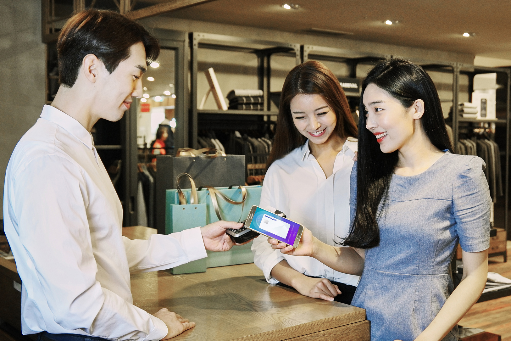 삼성전자의 모바일 결제서비스 삼성페이로 의류매장에서 결제하는 모습