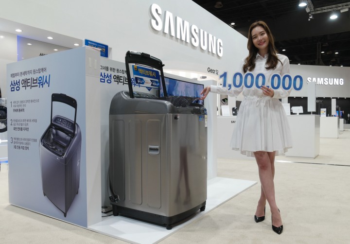 삼성전자 모델이 14일 킨텍스에서 열리는 ‘제46회 한국 전자산업대전(2015 KES)'에서 출시 9개월 만에 글로벌 판매 100만 대를 돌파한 ‘액티브 워시’ 세탁기를 소개하고 있다.