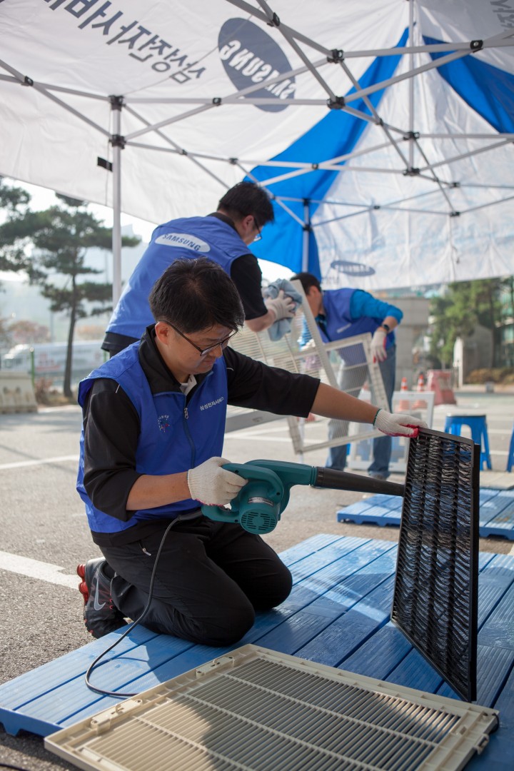 17일 삼성전자서비스 임직원들이 수원장애인종합복지관에서 냉난방시스템에어컨을 수리, 청소 하고 있다.