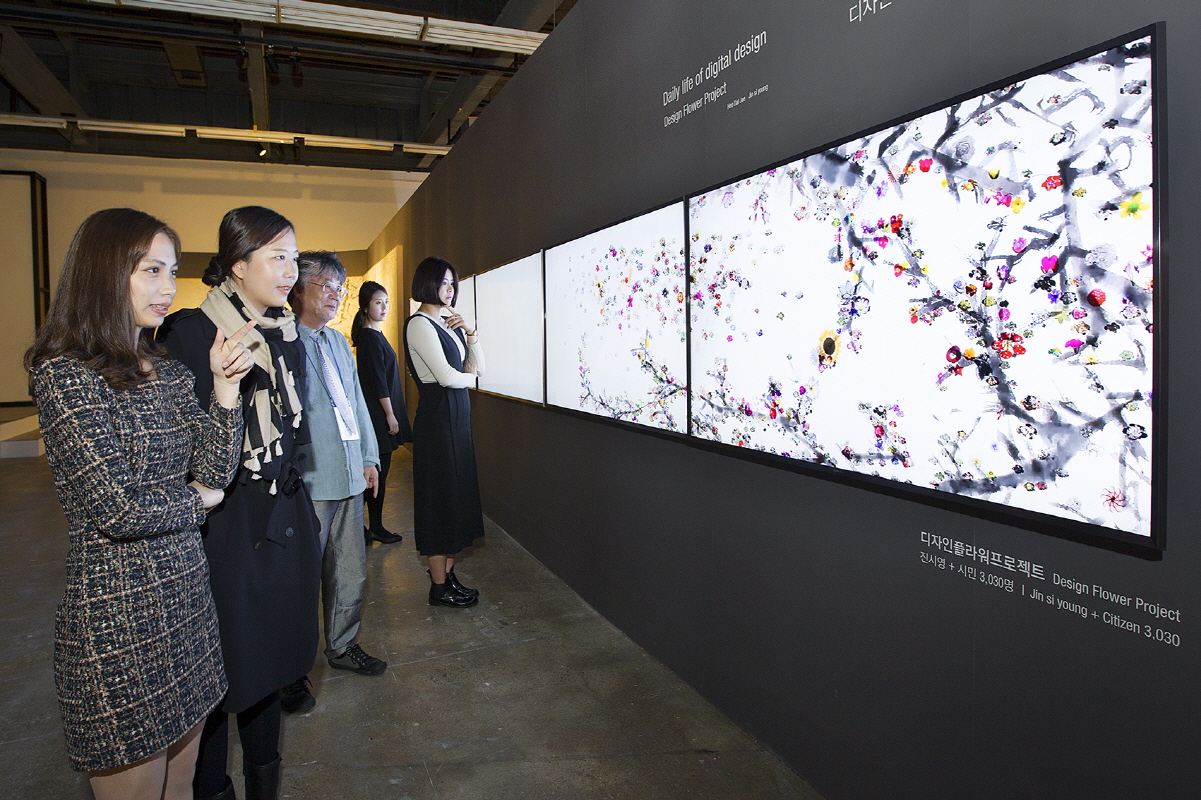 11월 13일까지 광주 중외공원 내 비엔날레 전시관에서 열리는 2015광주디자인비엔날레에서 관람객들이 삼성 SUHD TV 65형 5대를 연결해 만든 캔버스로 꽃의 아름다움을 담아낸 미디어 아트 '디자인 플라워'를 보고 있다.