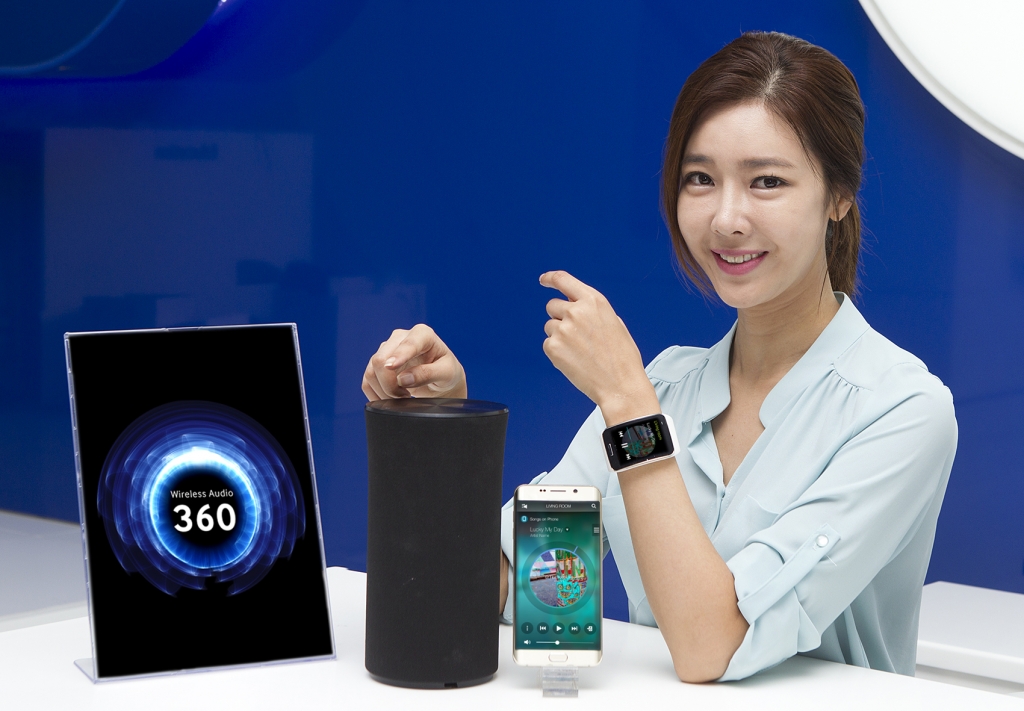 삼성전자 모델이 26일 삼성동 코엑스에 위치한 삼성 갤럭시 존에서 360도 어디서나 풍성한 사운드를 즐길 수 있는 무선 360 오디오 'R1'을 소개하고 있다.