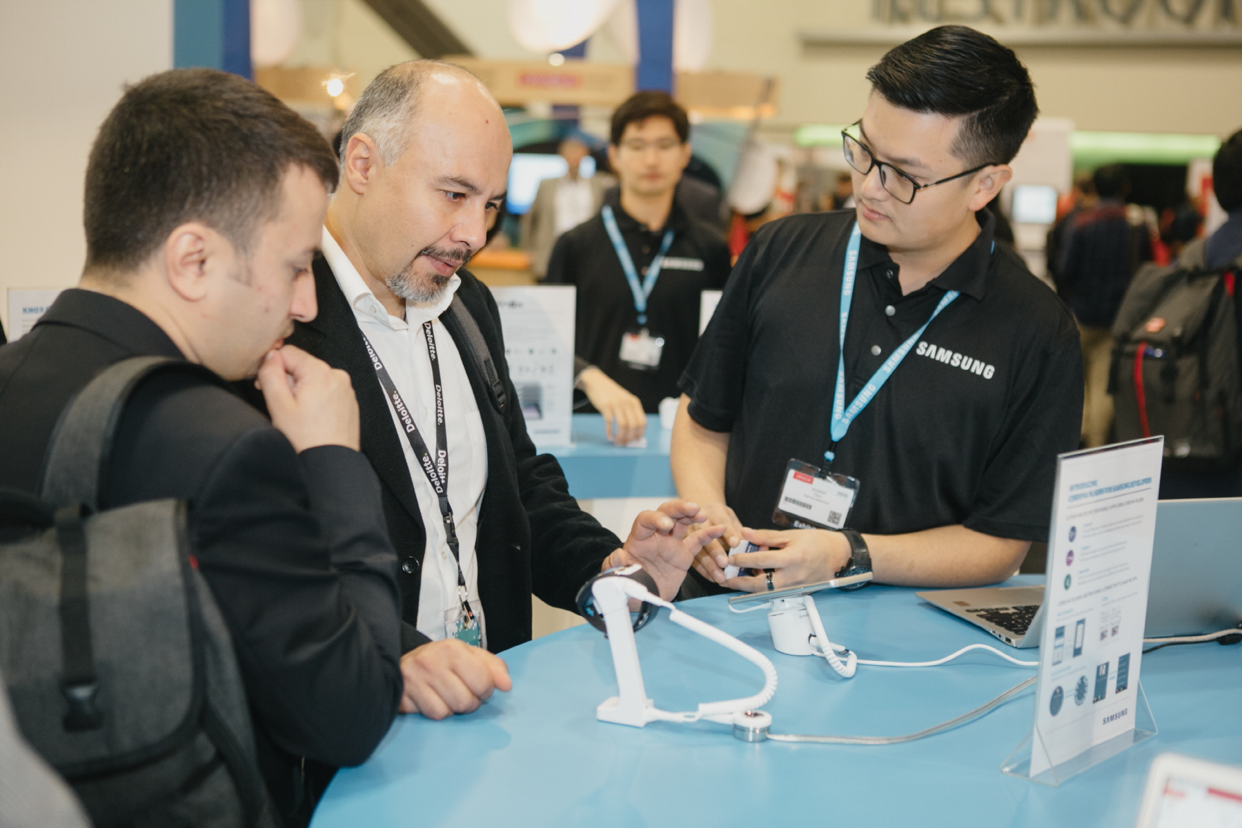 오라클 오픈월드에 참석한 기업 관계자와 개발자들이 삼성전자 전시장에서 삼성 스마트 기기로 시연되는 기업용 솔루션을 살펴보는 모습