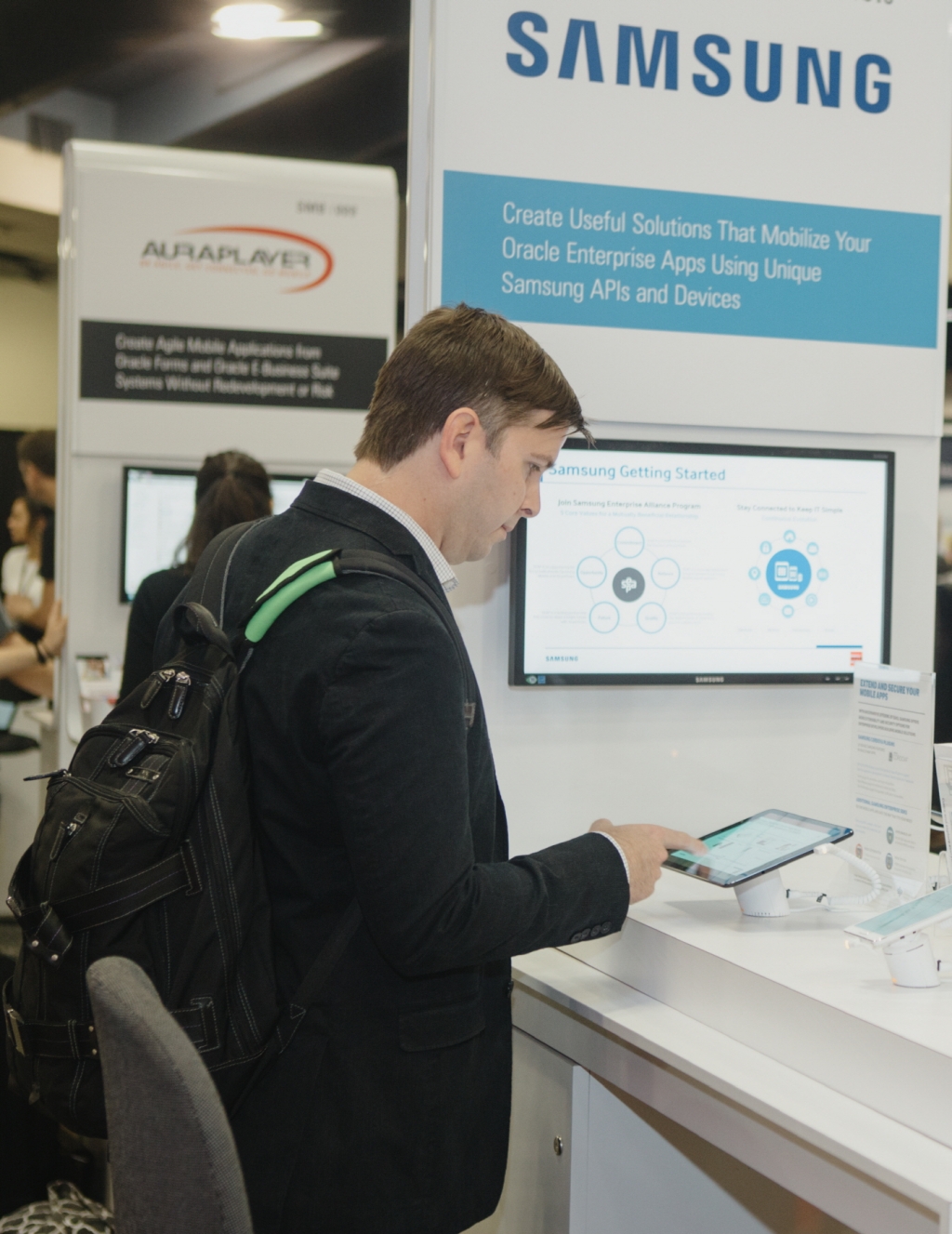 오라클 오픈월드에 참석한 기업 관계자와 개발자들이 삼성전자 전시장에서 삼성 스마트 기기로 시연되는 기업용 솔루션을 살펴보는 모습