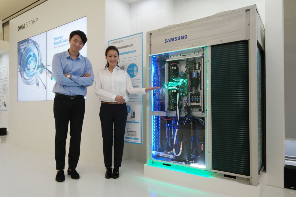 성전자 모델들이 설치 공간을 대폭 줄여주며 삼성전자의 절전 기술을 집약해 같은 용량대 최고 효율을 자랑하는 삼성 'DVM 칠러'를 소개하고 있다. 이 제품은 각 20톤 용량의 단일 모듈별로 간단하게 이동과 설치가 가능해 운송과 설치에 필요한 시간과 비용도 절감할 수 있다.