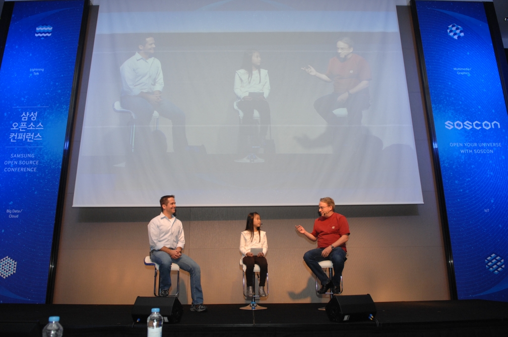 27일 여의도 콘래드 서울 호텔에서 열린 '삼성오픈소스컨퍼런스 2015' 행사에 초등학생 오픈소스 개발자인 김혜나 양(가운데)과 리눅스 커널을 처음으로 개발한 리누스 토발스(Linus Torvals)가 대담을 나누고 있다.