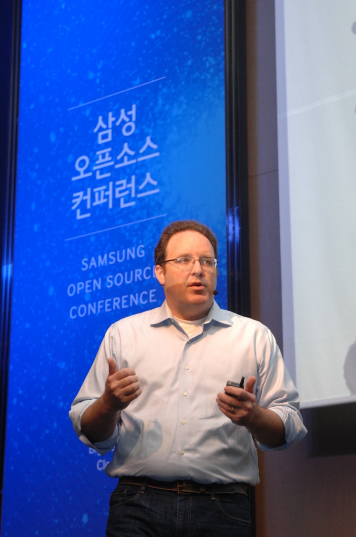 27일 여의도 콘래드 서울 호텔에서 열린 '삼성오픈소스컨퍼런스 2015' 행사에 아파치재단 부의장인 데이비드 낼리(David Nalley)가 기조연설을 하고 있다.
