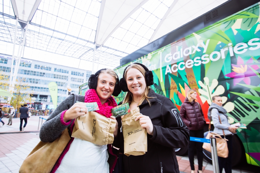 27일(현지 시각) 독일 뮌헨 국제공항에서 진행중인 삼성전자의 스마트기기 액세서리 체험 캠페인 '텐 미닛 브레이크'에서 소비자들이 행사 참여 후 즐거워하는 모습