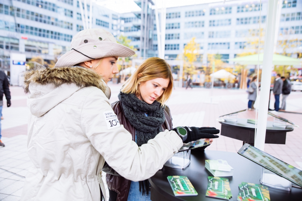 27일(현지 시각) 독일 뮌헨 국제공항에서 진행중인 삼성전자의 스마트기기 액세서리 체험 캠페인 '텐 미닛 브레이크'에서 삼성전자 관계자들이(가) 소비자(들)에게 행사를 소개하고 제품 체험을 안내하는 모습