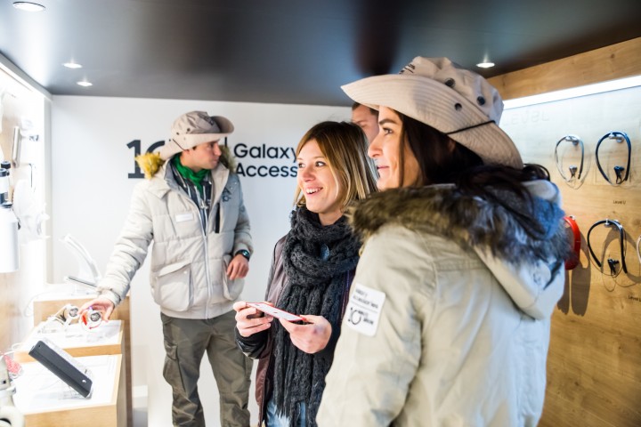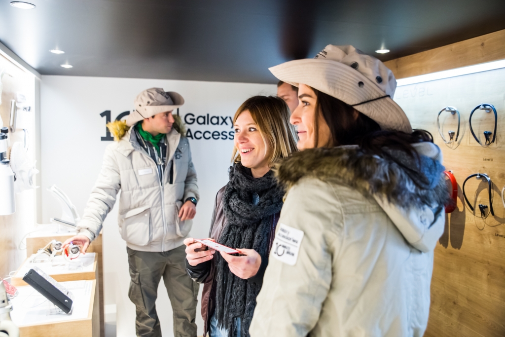 27일(현지 시각) 독일 뮌헨 국제공항에서 진행중인 삼성전자의 스마트기기 액세서리 체험 캠페인 '텐 미닛 브레이크'에서 삼성전자 관계자들이(가) 소비자(들)에게 행사를 소개하고 제품 체험을 안내하는 모습
