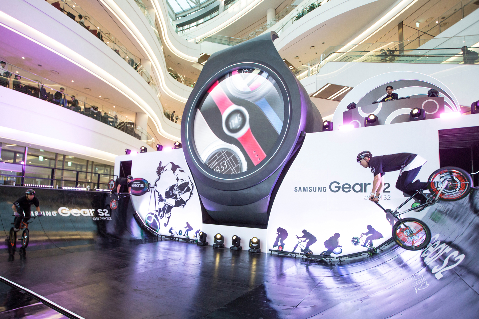 서울 영등포 타임스퀘어에 마련된 '기어 S2 휠 퍼포먼스' 행사장 전경. BMX 자전거 라이더들이 '기어 S2'의 다양한 혁신 기능을 역동적인 퍼포먼스로 선보이는 모습