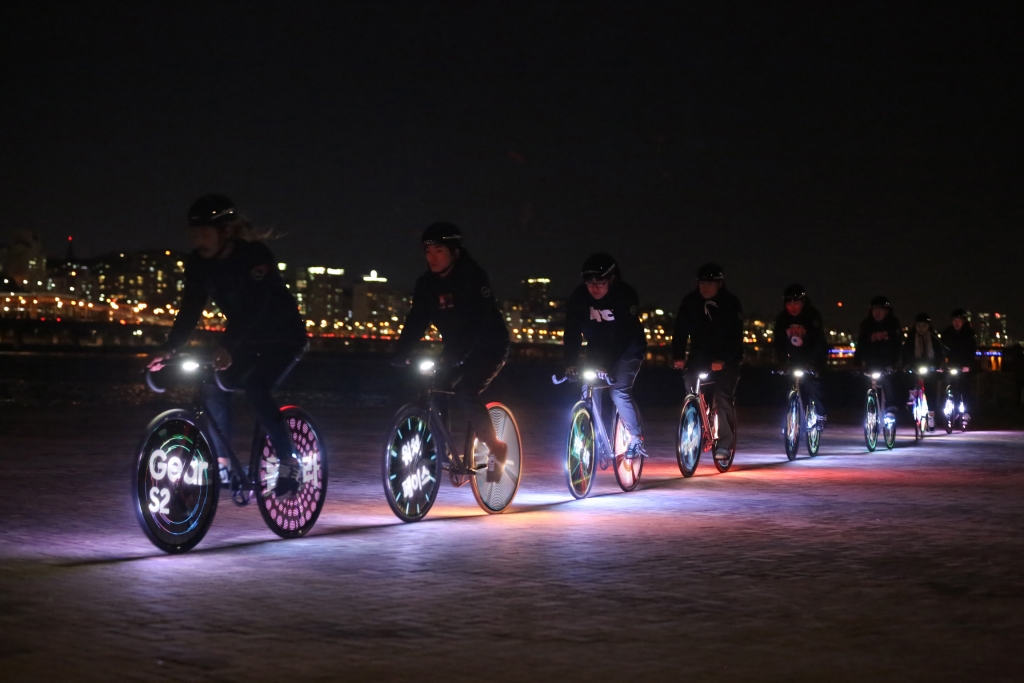 서울 한강시민공원 반포지구에서도 '기어 S2 휠 퍼포먼스' 행사가 펼쳐졌다. 라이더들이 '기어 S2'의 다양한 혁신 기능을 BMX 자전거의 원형 휠로 표현하는 모습