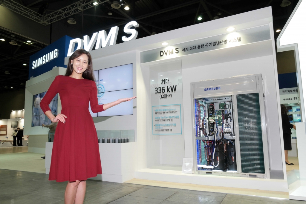 삼성전자 모델이 17~20일 일산 킨텍스에서 열리는 '2015 대한민국 에너지대전'에 전시된 삼성전자 전시부스에서 단일 용량 84kW(30마력)로 세계 최대 용량이면서도 콤팩트한 사이즈의 시스템에어컨 실외기 'DVM S' 신모델을 소개하고 있다.