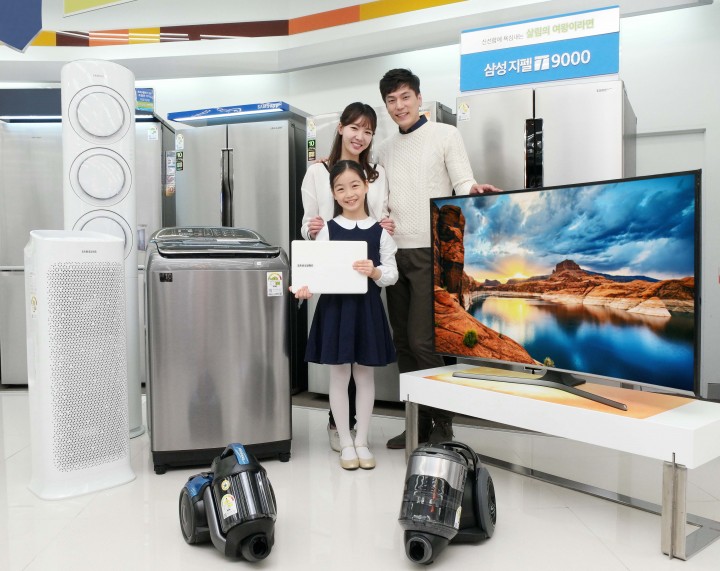삼성전자 모델들이 20일 삼성 디지털프라자 홍대점에서 '삼성전자 S 골드러시 패밀리 세일'을 소개하고 있다. sc