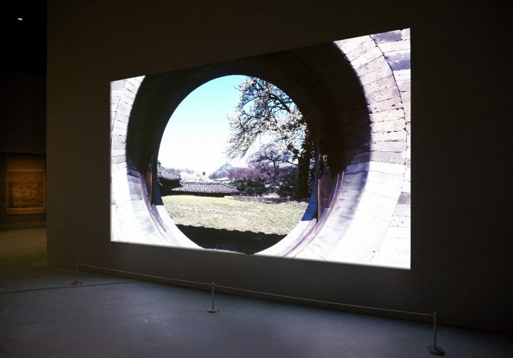 삼성미술관 Leeum의 기획전시실 설치된 173형 대형 스마트 LED 사이니지로 한국 대표 사진작가의 한국 전통 건축 사진과 동영상을 상영하고 있는 모습