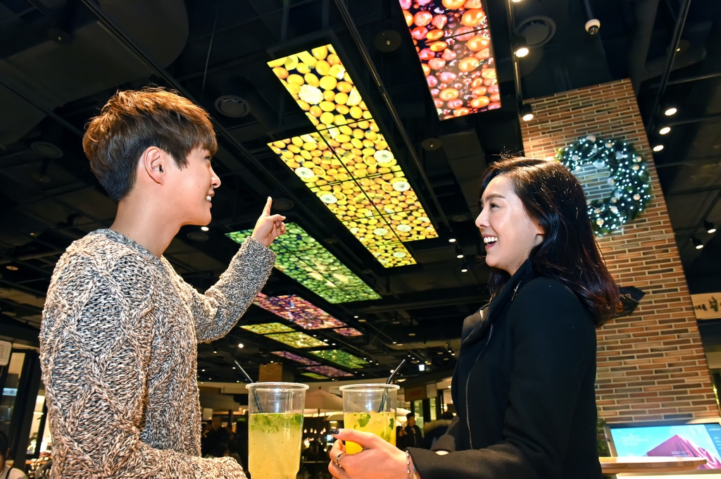 삼성전자 모델이 경기도 성남시 분당구에 위치한 현대백화점 판교점에서 삼성 스마트 사이니지를 체험하고 있다