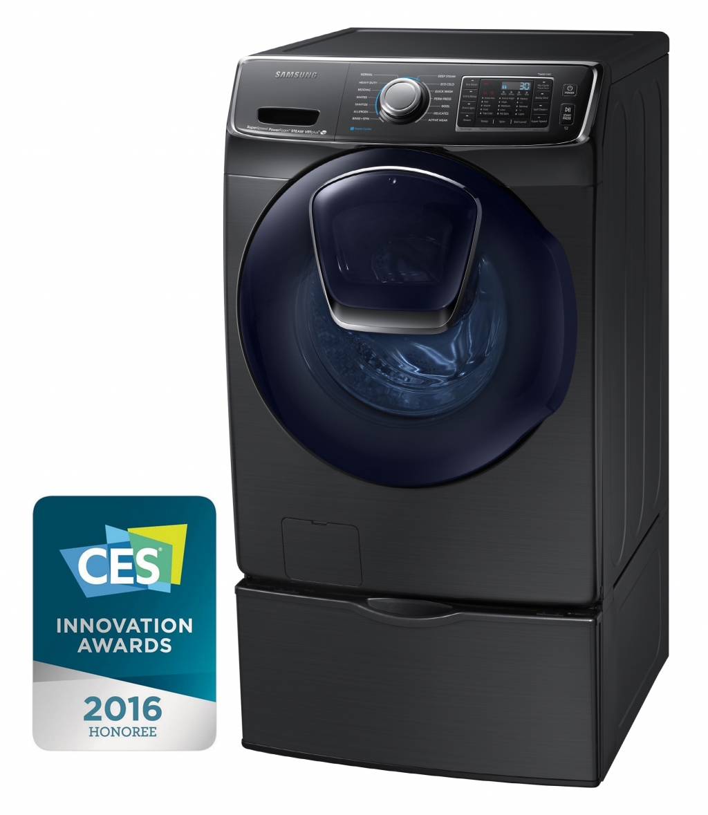'CES 2016' 혁신상 생활가전 부문 수상 제품으로 선정된 삼성 '애드워시' 드럼세탁기. 세계 최초로 세탁물 추가가 가능한 투입구인 ‘애드윈도우’를 도어 상단에 채용해 언제든지 세탁물을 간편하게 추가할 수 있다