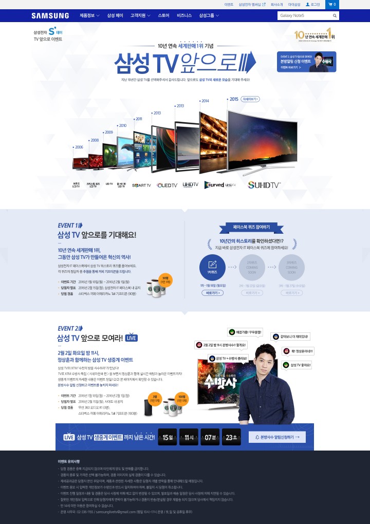 이에 삼성전자는 10년 연속 세계 TV 판매 1위를 할 수 있도록 삼성 TV를 선택해준 고객에게 감사하는 마음과 앞으로도 삼성 TV를 기대해달라는 의미를 담아 다음 달 1일까지 ‘삼성전자 S 데이 TV 앞으로 이벤트’를 실시한다.