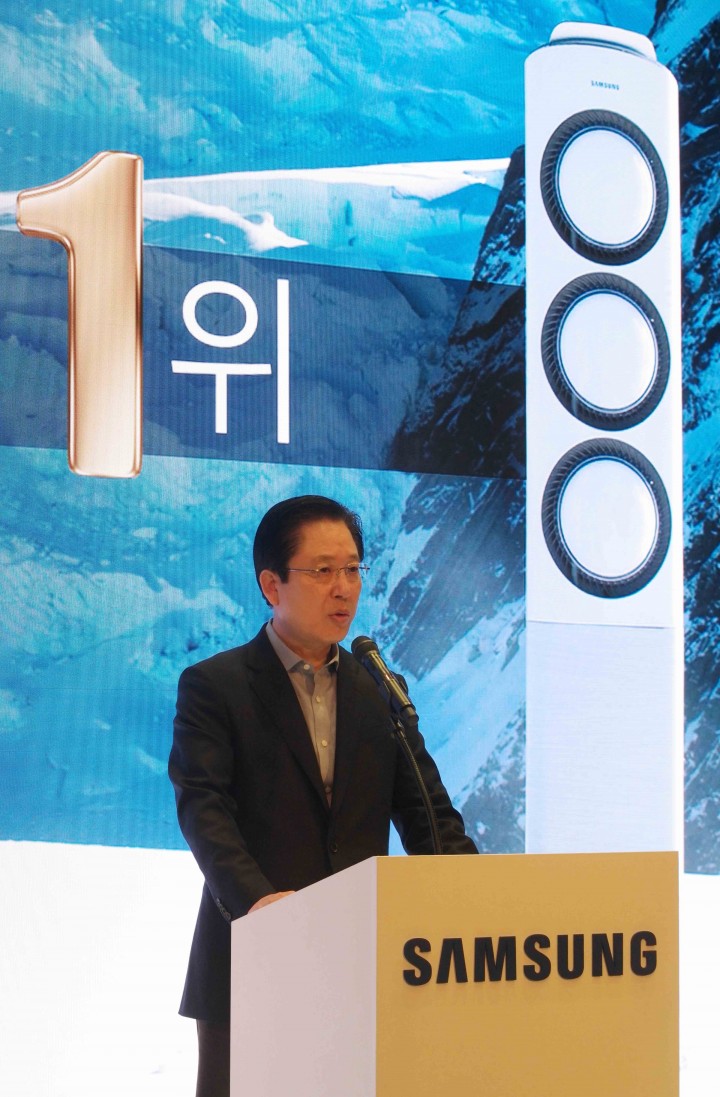 서병삼 삼성전자 생활가전사업부장 부사장이 바람 없이도 시원한 자연의 쾌적함을 제공하는 삼성 '무풍에어컨 Q9500'과 '정온냉동'으로 냉동실을 통해서도 소비자들에게 신선한 식재료를 선사하는 2016년형 삼성 '셰프컬렉션' 냉장고를 소개하고 있다