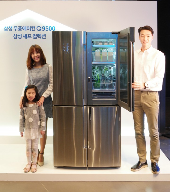 삼성전자 모델들이 바람 없이도 시원한 자연의 쾌적함을 제공하는 삼성 '무풍에어컨 Q9500'과 '정온냉동'으로 냉동실을 통해서도 소비자들에게 신선한 식재료를 선사하는 2016년형 삼성 '셰프컬렉션' 냉장고를 소개하고 있다