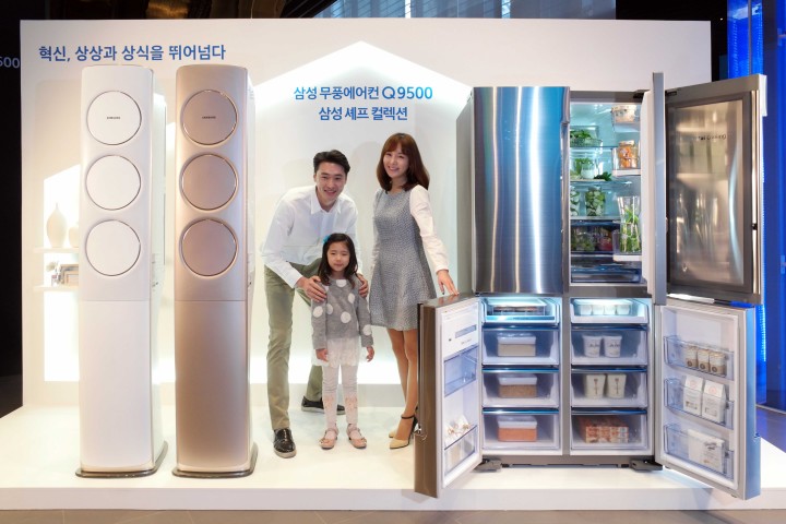 삼성전자 모델들이 바람 없이도 시원한 자연의 쾌적함을 제공하는 삼성 '무풍에어컨 Q9500'과 '정온냉동'으로 냉동실을 통해서도 소비자들에게 신선한 식재료를 선사하는 2016년형 삼성 '셰프컬렉션' 냉장고를 소개하고 있다