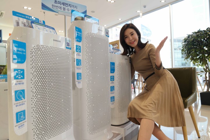 삼성전자 모델이 27일 논현동 삼성 디지털프라자 강남 본점에서 삼성전자 초미세 공기청정기 '블루스카이' 신제품을 소개하고 있다