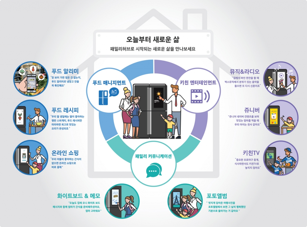 삼성전자는 미디어데이를 통해 식재료 보관뿐 아니라 커뮤니케이션ㆍ쇼핑ㆍ엔터테인먼트 등 새로운 경험을 제공하는 ‘패밀리 허브’를 소개하며, 주방을 식사와 요리만을 위한 공간을 넘어 가족 생활의 중심이 되는 공간으로 제시했다.