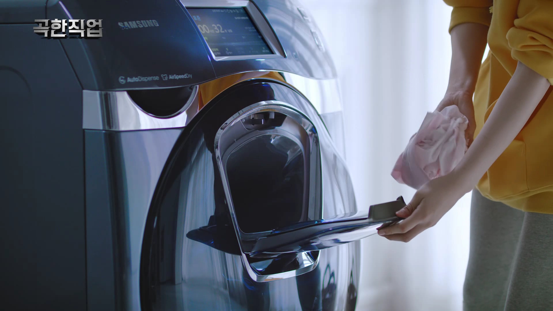 삼성전자는 '곡한직업-드라마 연출부 막내 편' 영상을 통해 드라마 촬영 현장을 배경으로 세탁 중간에 세탁물을 쉽게 추가할 수 있는 '애드워시' 세탁기만의 장점을 재미있게 표현했다.