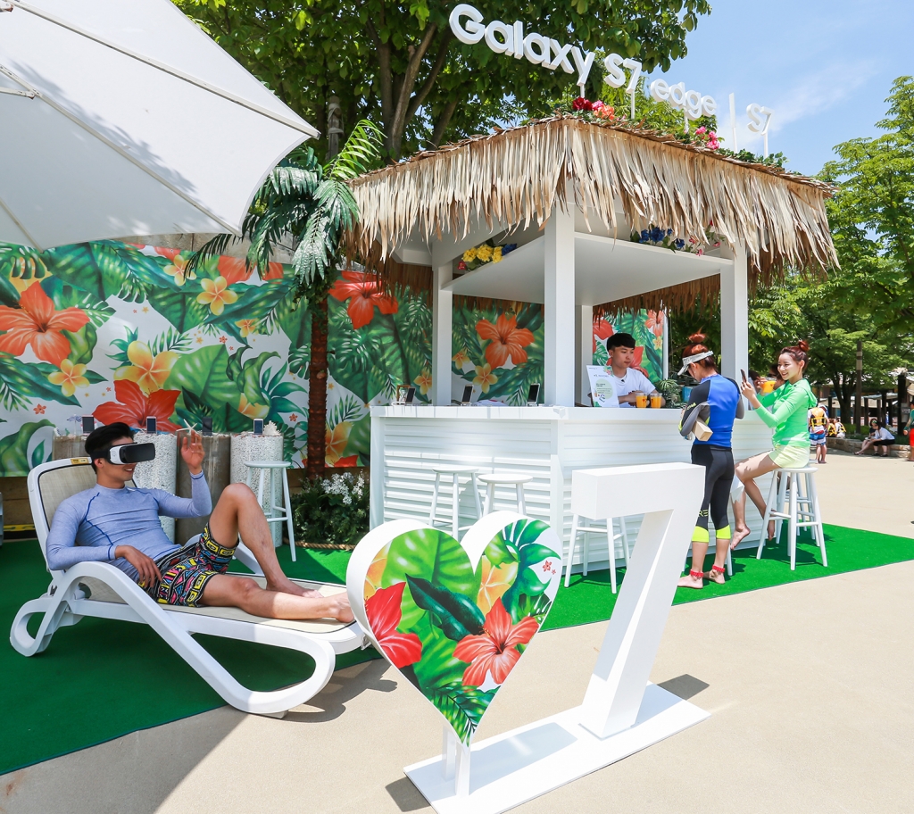 외부 매표소 앞에 캐리비안 베이 입장 대기 고객을 위해 마련된 ‘갤럭시 S7’ 체험존에서는 카메라·방수·게임 기능 체험과 함께 현장 구매도 가능하다.