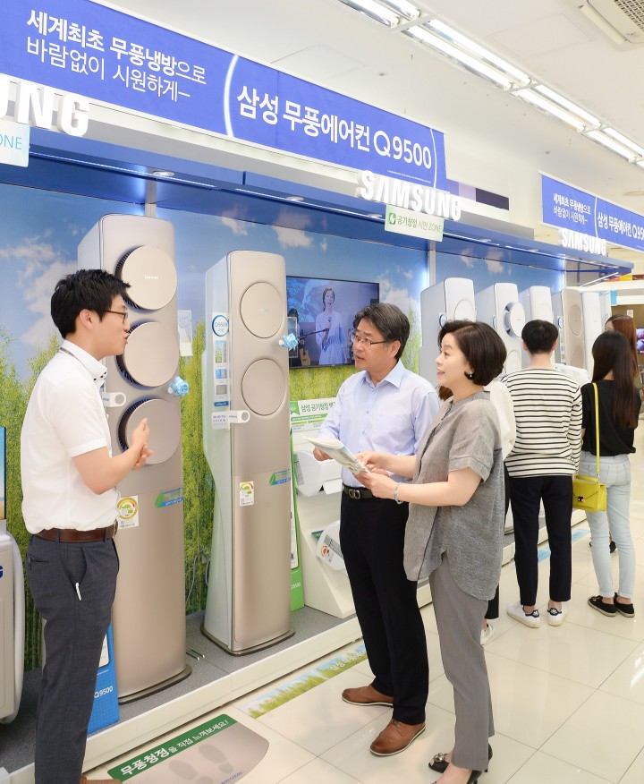 삼성전자 모델들이 8일 염창동 삼성 디지털프라자 강서본점에서 찬 바람이 직접 닿지 않는 '무풍냉방'과 초미세먼지를 99.9% 잡는 공청 기능으로 인기를 끌고 있는 삼성 무풍에어컨 'Q9500'을 보고 있다.