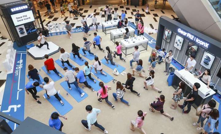 삼성전자는 15일부터 17일까지 여의도 IFC몰에 피트니스 컨셉의 이색 체험 공간을 만들고, 선에서 완전히 자유로워진 혁신적 디자인의 웨어러블 이어셋 ‘기어 아이콘X’와 자체 GPS를 탑재해 더욱 정확해진 ‘기어 핏2’를 소비자들이 직접 경험할 수 있게 했다.