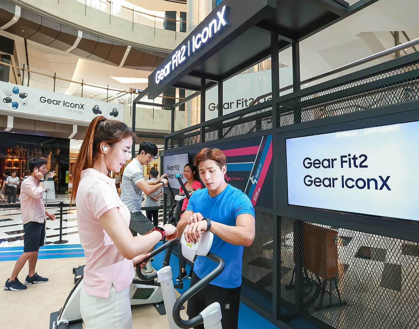 삼성전자는 15일부터 17일까지 여의도 IFC몰에 피트니스 컨셉의 이색 체험 공간을 만들고, 선에서 완전히 자유로워진 혁신적 디자인의 웨어러블 이어셋 ‘기어 아이콘X’와 자체 GPS를 탑재해 더욱 정확해진 ‘기어 핏2’를 소비자들이 직접 경험할 수 있게 했다.