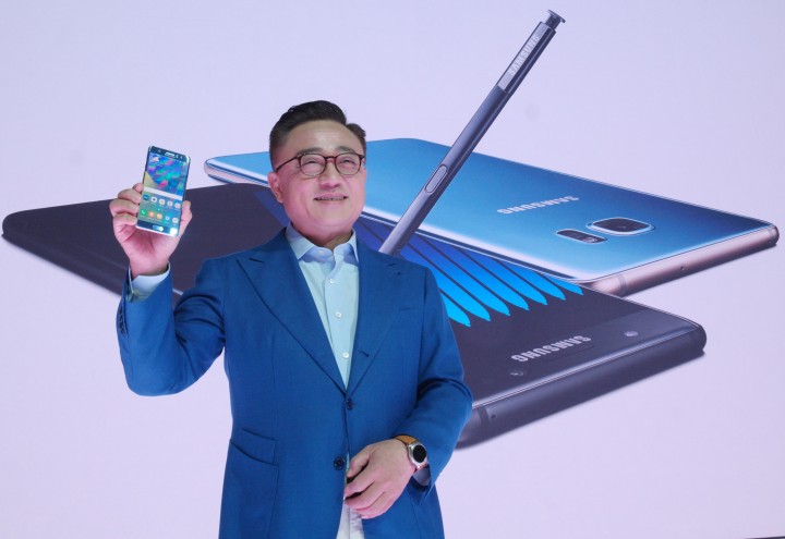 ▲삼성전자 무선사업부장 고동진 사장이 2일(현지시간) 미국 뉴욕에서 열린 ‘삼성 갤럭시 언팩’ 행사에서 ‘갤럭시 노트7’을 소개하고 있다.
