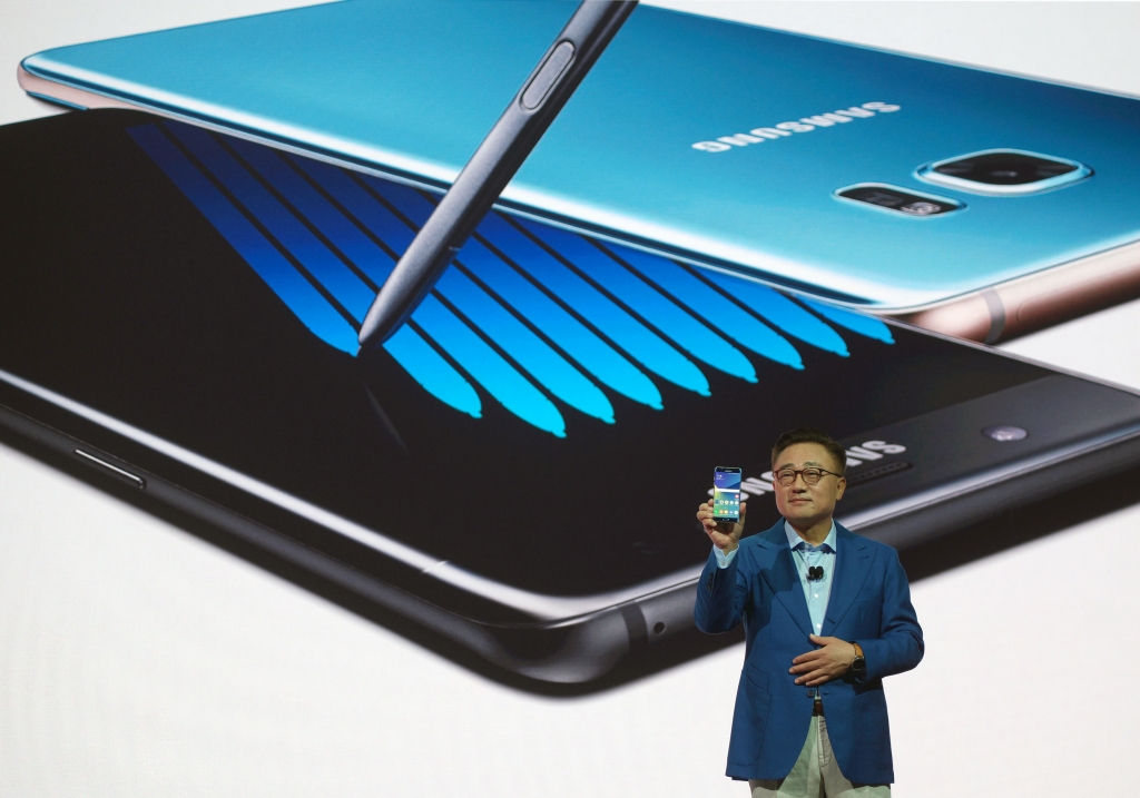 ▲삼성전자 무선사업부장 고동진 사장이 갤럭시 노트7을 소개하는 모습