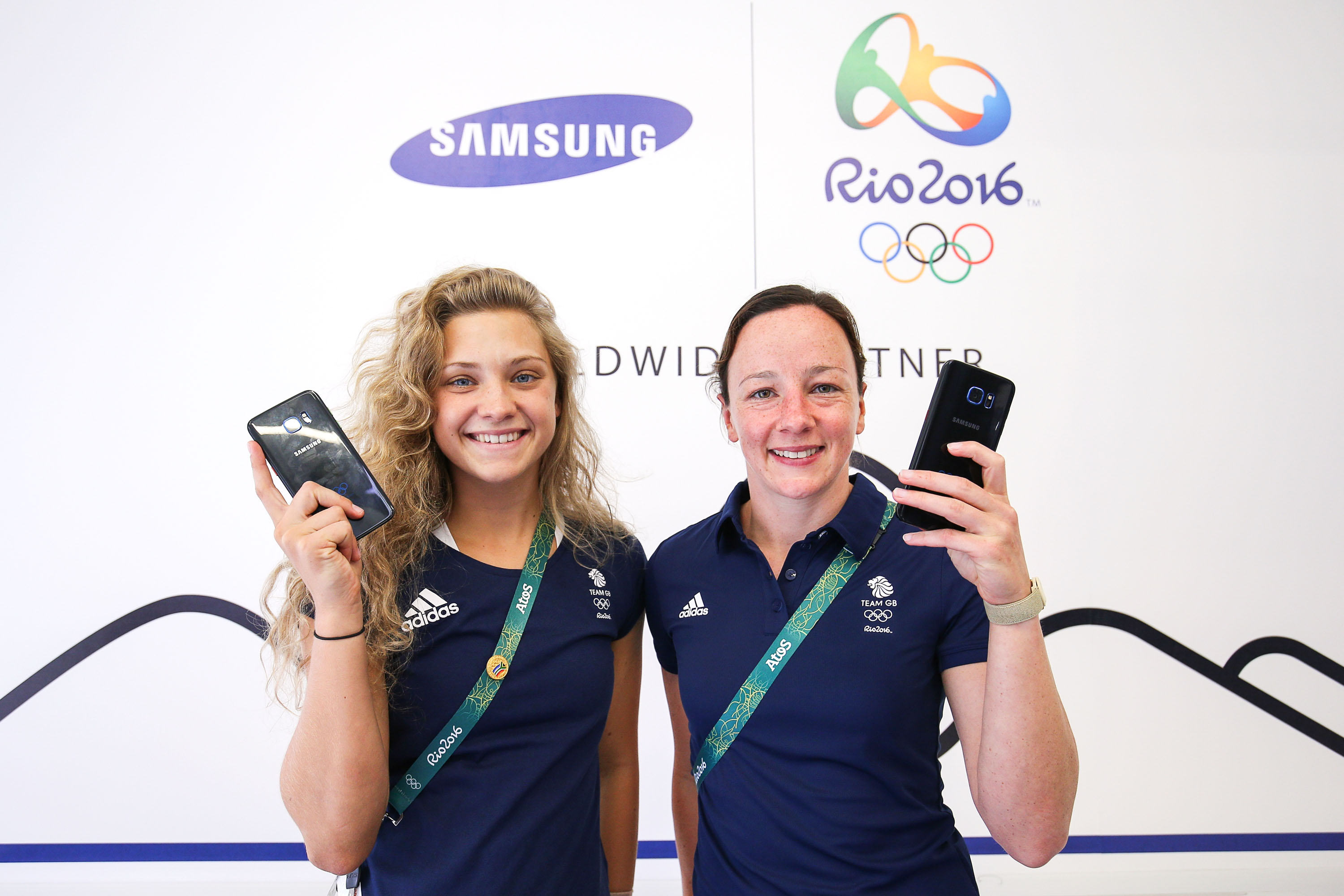 2016 리우 올림픽 개막을 사흘 앞둔 3일(현지시간) 브라질 올림픽 선수촌 내 삼성전자 갤럭시 스튜디오에서 여자 싱크로나이즈 영국 대표팀 알리시아 블래그(Alicia Blagg) 선수(왼쪽)와 레베카 갤랜트리(Rebecca Gallantree) 선수(오른쪽)가 ‘갤럭시 S7 엣지 올림픽 에디션’ 을 전달받고 있다. 리우 올림픽 무선통신 분야 공식 파트너사 삼성전자는 이 '올림픽 에디션'을 올림픽에 참가하는 1만2천5백명 선수 전원에게 제공한다.