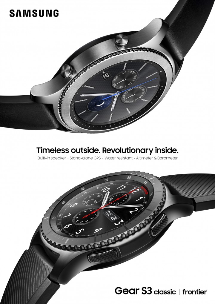 야외 활동과 활동적인 라이프 스타일에 적합한 ‘프론티어’와 럭셔리한 시계 타입의 ‘클래식’ 두 모델로 선보이는 ‘기어 S3’는 스테인리스 스틸 소재의 바디에 전통적인 시계 느낌을 극대화해 정교하게 디자인됐다.