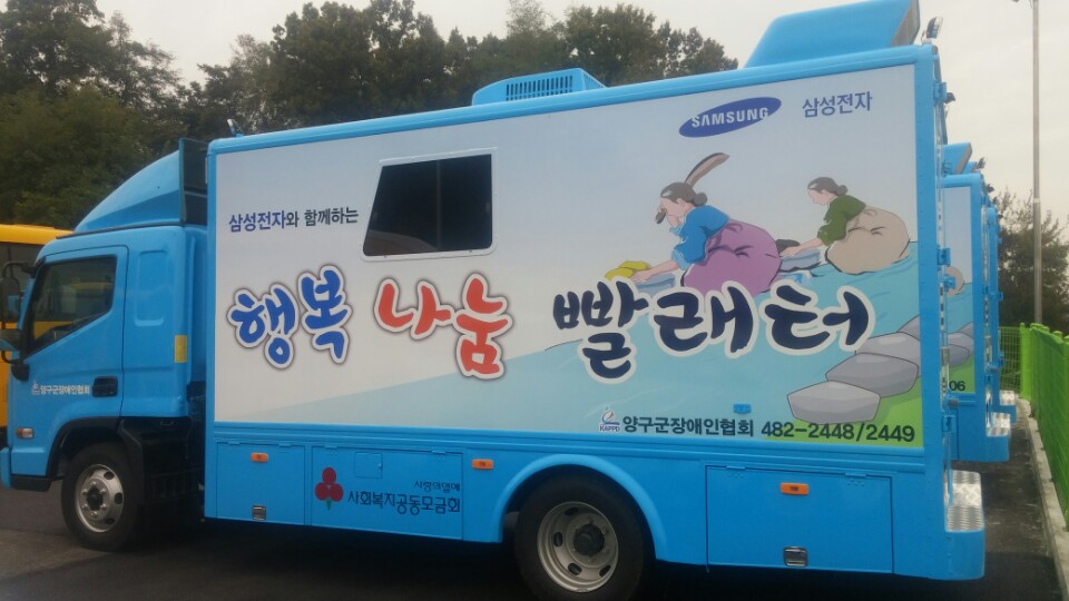 「행복나눔 빨래터」는 2.5톤의 차량에 드럼세탁기(21kg) 4대가 탑재된 이동세탁차량이다.
