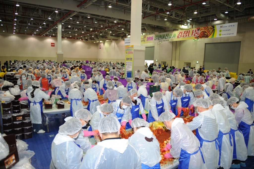 구미에서는 삼성전자 스마트시티와 구미시 새마을회 공동 주최로 지역 복지단체와 삼성전자 임직원 등 700여 명의 자원봉사자들이 이웃을 위한 김치 만들기에 힘을 모았다.