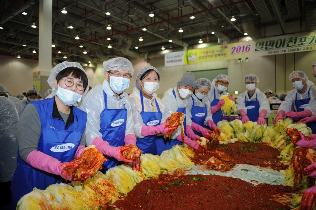 구미에서는 삼성전자 스마트시티와 구미시 새마을회 공동 주최로 지역 복지단체와 삼성전자 임직원 등 700여 명의 자원봉사자들이 이웃을 위한 김치 만들기에 힘을 모았다.