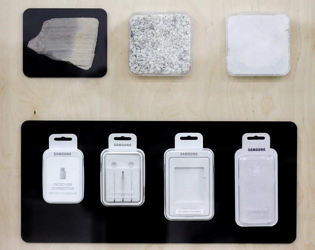 기존에 폴리프로필렌(PP) 재질로 만들었던 휴대폰 액세서리 포장재를 천연 돌가루 성분으로 부분 대체하여 석유계 자원을 40% 가량 절감하는 친환경 기술 공법을 적용했다.