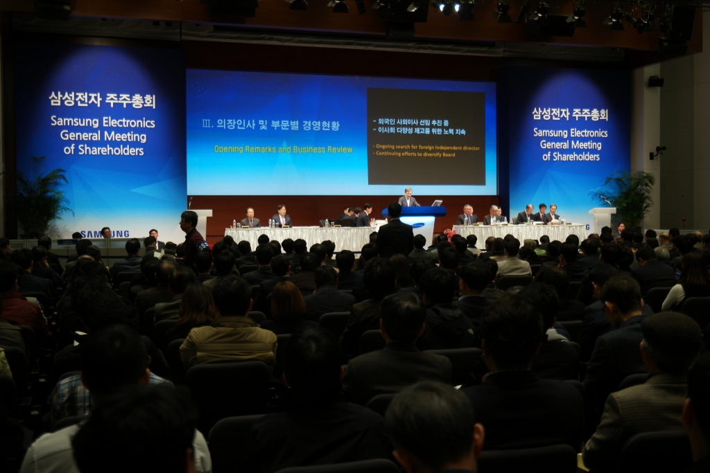 삼성전자는 24일 서초사옥 다목적홀에서 주주, 기관투자자, 권오현 대표이사 부회장, 윤부근 대표이사 사장, 신종균 대표이사 사장 등 400여명이 참석한 가운데 '제48기 정기 주주총회'를 개최했다.